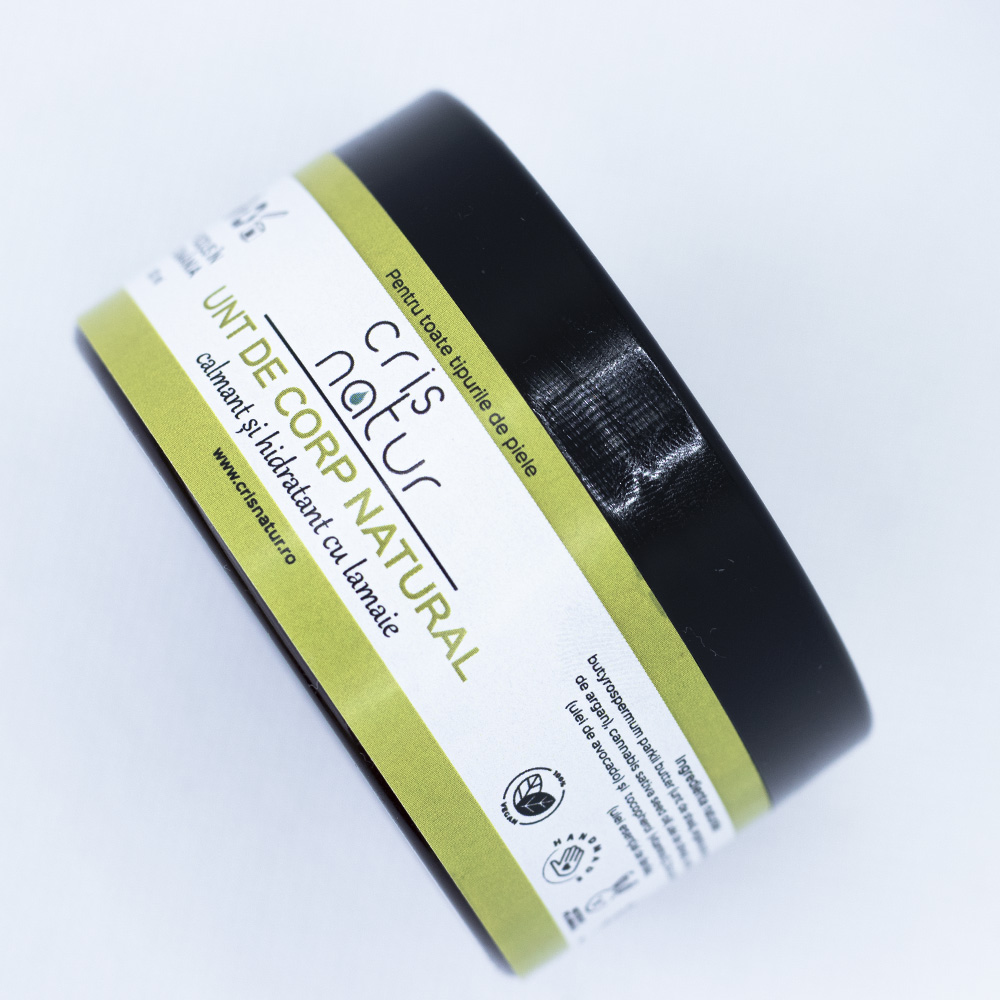 Untul de corp cu unt de Shea îmbogățit cu ulei de argan, ulei de cânepa, ulei de avocado, ulei de lămâie și vitamina E catifelează și hidratează pielea.