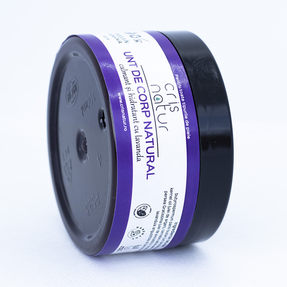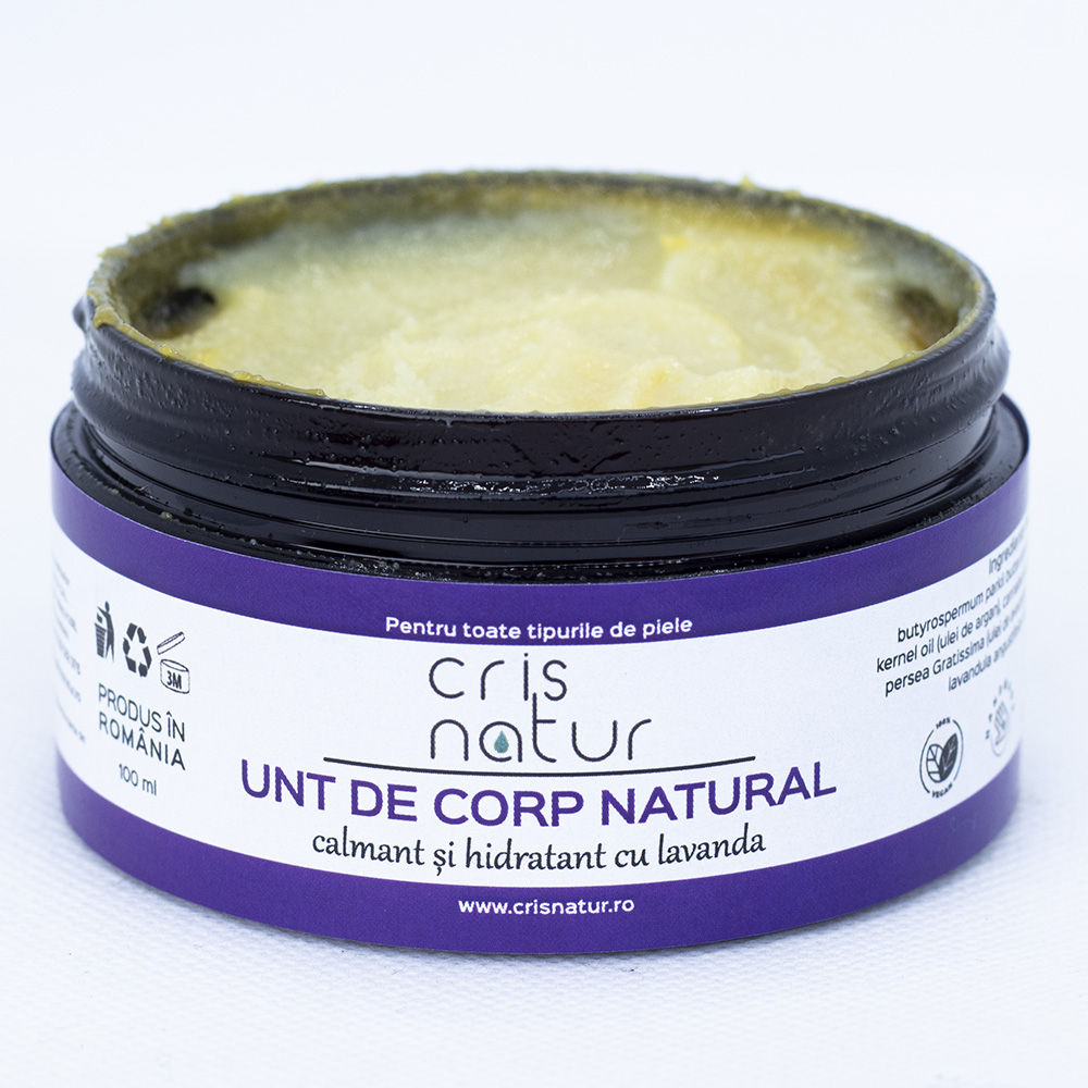 Unt de corp cu unt de Shea îmbogățit cu ulei de argan, ulei de cânepa, ulei de avocado, ulei de lavandă și vitamina E