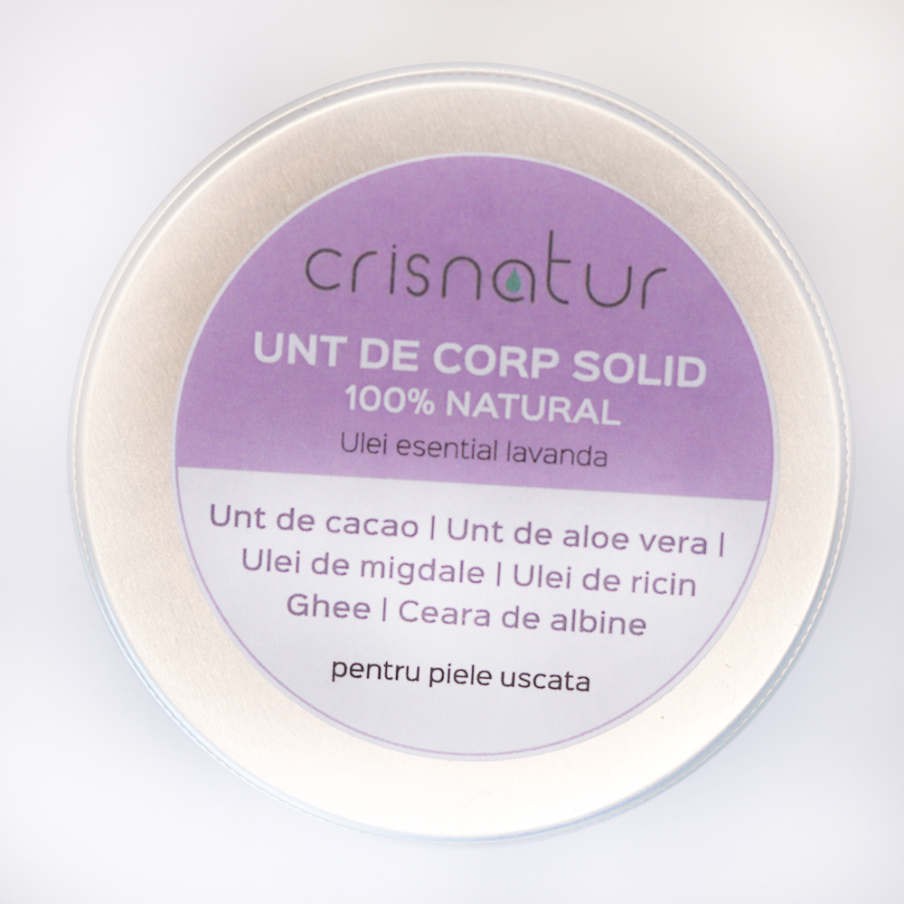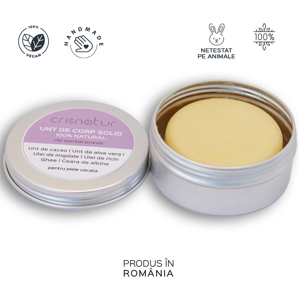 Hidratează și regenerează-ți pielea uscată cu untul de corp solid cu lavanda, 100% natural și realizat manual în România. Formulă simplă, cu ingrediente pure și eficiente, pentru o piele catifelată și sănătoasă