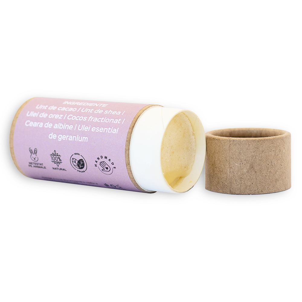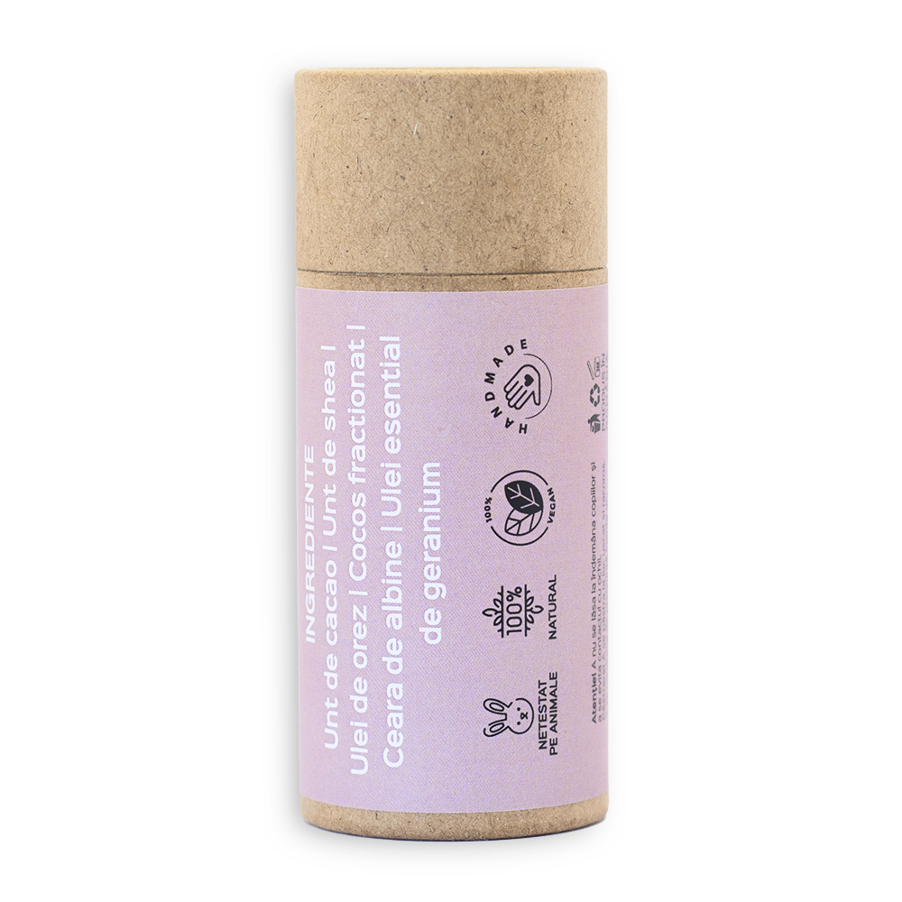 Hidratează și regenerează-ți pielea uscată cu untul de corp solid cu geranium, 100% natural și realizat manual în România. Formulă simplă, cu ingrediente pure și eficiente, pentru o piele catifelată și sănătoasă